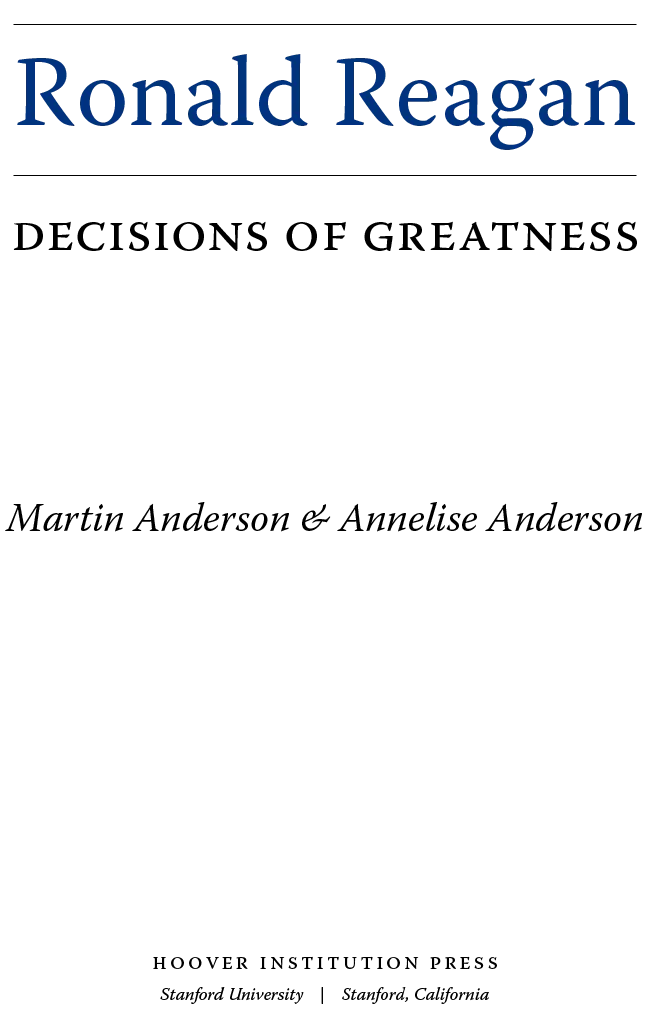 For permission to reuse material from Ronald Reagan: Decisions of Greatness, ISBN 978-0-8179-1834-7, please access www.copyright.com or contact the Copyright Clearance Center, Inc. (CCC), 222 Rosewood Drive, Danvers, MA 01923, 978-750-8400. CCC is a not-for-profit organization that provides licenses and registration for a variety of uses.