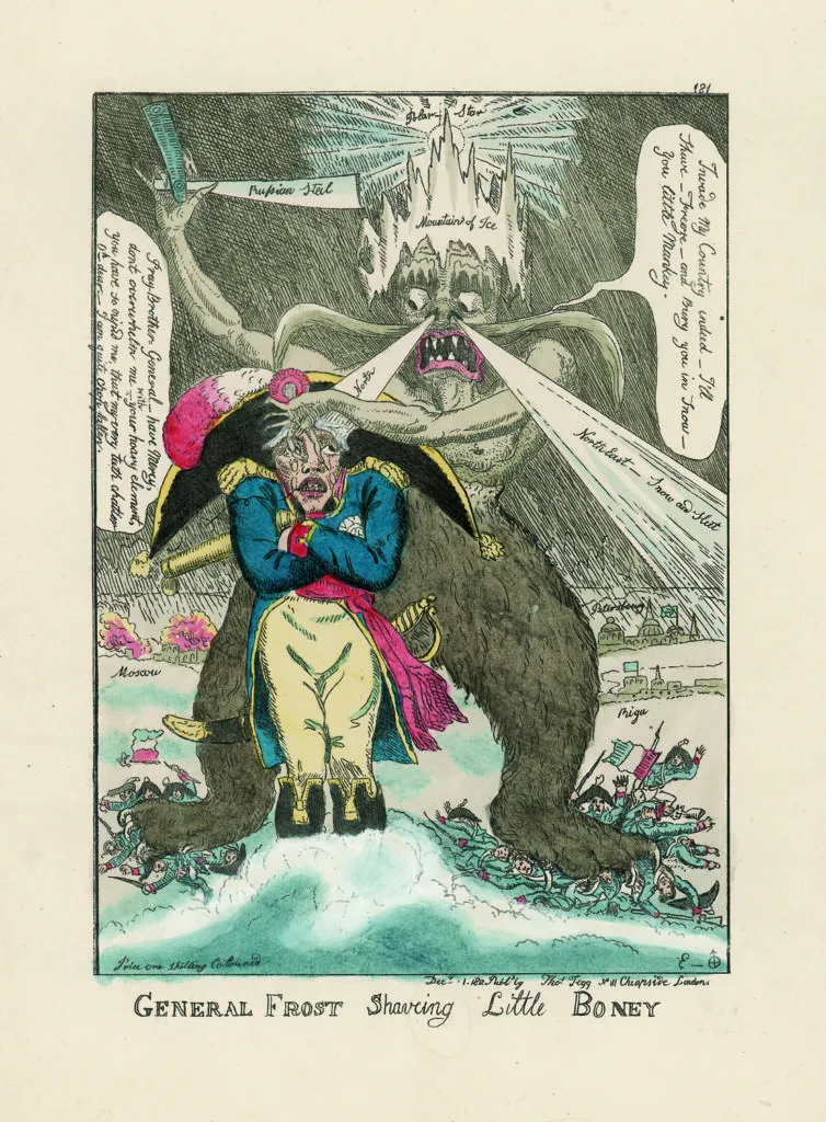 British caricature dated 1812 of âGeneral Winterâ defeating Napoleon during his withdrawal from Russia in 1812.