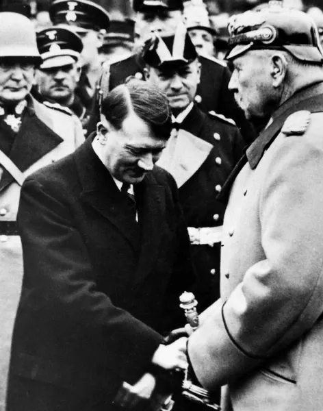 Adolf Hitler, as Chancellor, bows to President von Hindenburg at a memorial service in Berlin in June 1934. Immediately on Hindenburgâs death Hitler merged the offices of Chancellor and President to become Der FĂŒhrer.