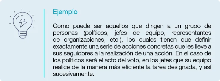 Podemos continuar con el segundo de los casos, en el que se describe la definición, por las actividades del líder. Dando por hecho la existencia de dicha figura, y se pone el foco, no en una actividad casual como en el ejemplo anterior, sino en una acción intencionada para realizar la acción de liderar.