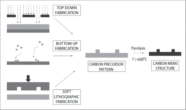 One process that facilitates the fabrication of amorphous or glassy carbon microstructures involves the pyrolysis of carbon-containing precursor molecules (usually polymers) that have been prefabricated into requisite micro/nanostructures (Figure 1.1). Pyrolysis or carbonization is the method of heating carbon-containing precursors to temperatures upward of 600 °C in an inert atmosphere such as nitrogen or argon to remove noncarbonaceous components in a material by volatilizing them into gaseous and hence removable compounds. This method, apart from allowing the creation of any required shape as long as appropriate formable precursors are used, also allows tweaking the properties of the final carbon micro/nanostructures by the rational use of various precursors with different functional groups. Appropriate precursors are those carbon-containing polymers that result in a high enough yield of carbonaceous residue and at the same time do not reflow when subjected to high temperatures during pyrolysis [2]. Thus, the methods to create glassy carbon MEMS structures can be decoupled into various methods to create microstructures in appropriate precursors and the pyrolysis processes (Figure 1.1).