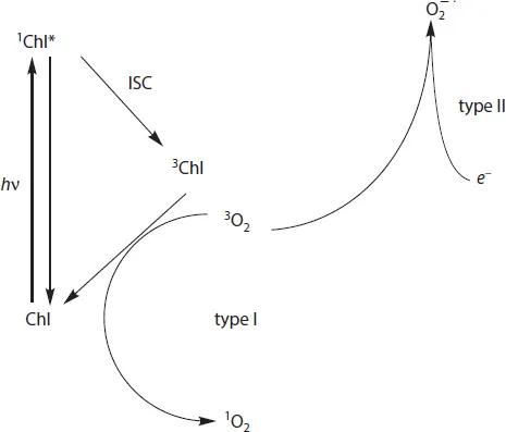 3Chl can be populated either via intersystem crossing (ISC) of antenna Chls or via radical pair recombination in the reaction centers (RCs) of photosystem II (PS II) (for reviews, see Renger, 2008; Vass and Aro, 2008; Rutherford et al., 2012; Schmitt et al., 2014a). Alternatively, 1ΔgO2 can also be formed in a controlled fashion by chemical reactions, which play an essential role in programmed cell death upon pathogenic infections (e.g. by viruses).