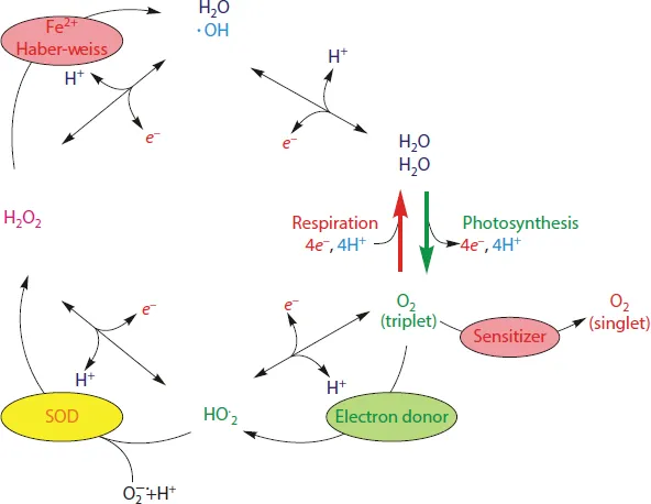 Figure 1.2 schematically illustrates the pattern of one-electron redox steps of oxygen forming the ROS species HO•, H2O2 and HO•2/O−•2 in a four-step reaction sequence with water as the final product. The sequence comprises the water splitting, leading from water to O2 + 4H+ and the corresponding mechanism vice versa of the ROS reaction sequence. The production of 1Δg O2 is a mechanism next to that.