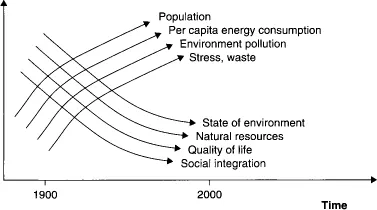 Figure 1.1 shows the nature of the problem currently facing human habitat as a result. Value indices that would imply improvement of human social status have declined. At the same time, per capita energy consumption has increased. This figure thus clearly signals a problem of direction in technology development. If increasing per capita energy consumption is synonymous with economic growth, — in line with modern-day notions of gross domestic product (GDP) — then further economic growth could only mean an even worse decline in the quality of the environment. What appears on its surface to be a very difficult but essentially technological problem, therefore, is also a fundamental problem of the outlook that has come to prevail in modern society’s evolution since the European Renaissance into the current-day Information Age.