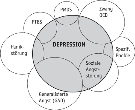 Das gemeinsame Auftreten von Angst und Depression geht einher mit einem schwereren Verlauf, vermehrter Inanspruchnahme medizinischer Dienste und größerer Einschränkung der Arbeitsfähigkeit. Abbildung 1 zeigt die Überlappung der Depression mit anderen Zustandsbildern (man spricht hier auch von Komorbidität).