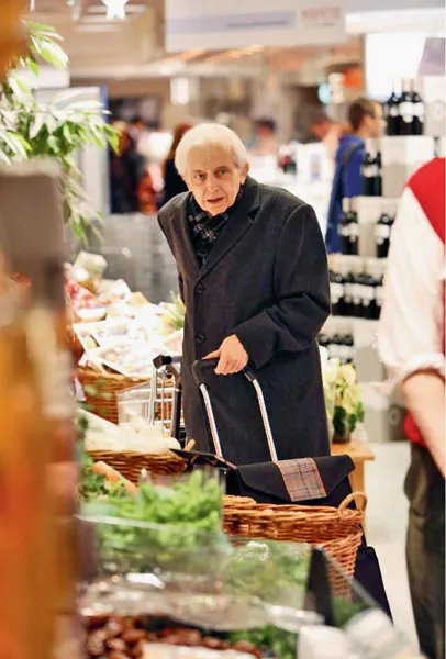 Die Fahrt endete nach wenigen Minuten vor dem Karstadt an der Münchner Freiheit. Auf der Suche nach Batterien fuhr Gurlitt in die Elektronikabteilung im vierten Stock. Trierweiler, der begonnen hatte, den alten Mann unauffällig mit seiner Handykamera zu fotografieren, schickte Le Bailly jetzt los, um eine bessere Kamera zu kaufen. Ohne Erfolg. Im ganzen Kaufhaus war kein Fotoapparat aufzutreiben. Über die Redaktion in Paris wurde ein Agenturfotograf angefordert. Dabei kam den beiden französischen Journalisten zugute, dass Gurlitt sehr bedächtig vorging und die Waren ausführlich studierte, bevor er sich zum Kauf entschied. Als Goran Gajanin, ein erfahrener Münchner Pressefotograf, nach über einer Stunde eintraf, befand sich Gurlitt immer noch in dem Kaufhaus an der Kasse der Lebensmittelabteilung im Untergeschoss.14 Mit einem Teleobjektiv machte sich Gajanin sofort an die Arbeit. Dutzende Bilder zeigen Cornelius Gurlitt, wie er seinen Einkaufskorb Stück für Stück leert und seine Einkäufe auf das Transportband legt. Nach dem Bezahlen wandte sich Gurlitt zum Ausgang und ging dabei ein paar Schritte direkt auf Gajanin zu, ohne ihn freilich zu bemerken.