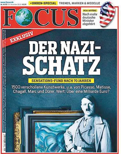 Sonntag, der 3. November 2013 war der Tag, an dem Cornelius Gurlitt aus seiner Anonymität gerissen wurde. Um acht Uhr morgens erschien die Digitalausgabe des Magazins Focus;1 auf der Titelseite stand in fetten Lettern: »DER NAZI-SCHATZ«. Auf Seite 64 folgte dann die Geschichte der 1.500 Kunstwerke, die angeblich zur »Beute Hitlers« gehört hatten und von der Staatsanwaltschaft im Jahr zuvor in Gurlitts Wohnung beschlagnahmt worden waren. Und schon in der zehnten Zeile, neben einem doppelseitigen Foto von Adolf Hitler, sein vollständiger Name »Rolf Nikolaus Cornelius Gurlitt« und sein Geburtsdatum.2 Bei Erscheinen des Focus war Gurlitt 80 Jahre alt. Außerdem erfolgte in dem Artikel der Hinweis, dass er in München-Schwabing lebe, dazu gab es ein Foto seines Apartmenthauses, eines vom Eingangsbereich und eines von seinem Klingelschild.3