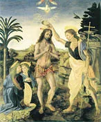 ![]() | 2 Andrea del Verrocchio, Taufe Christi (Florenz, Uffizien). Von Leonardo stammt der kniende Engel am linken Bildrand. Entstanden um 1473–1475 in der Werkstatt Verrocchios |