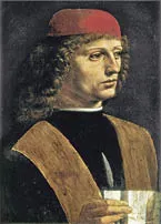 ![]() | 9 Bildnis eines Musikers (Mailand, Pinacoteca Ambrosiana). Entstanden wohl Mitte der 1480er-Jahre; die Zuschreibung an Leonardo ist sehr umstritten. |