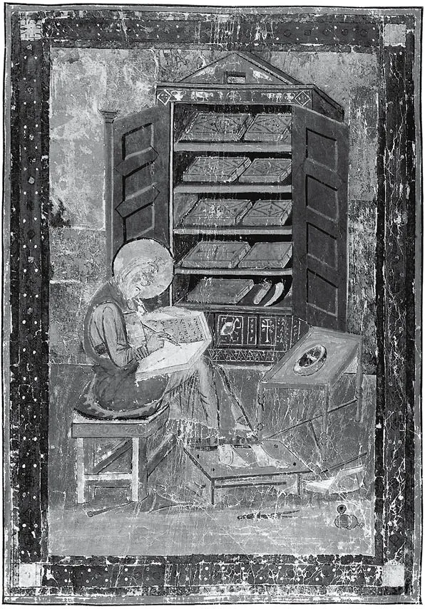 Die Bibel ist demnach genau genommen kein Buch, sondern eine Büchersammlung oder eine «Bibliothek». In dieser Form – als Sammlung meist mehrteiliger Bücher, etwa der fünf Bücher der Tora (bzw. des Pentateuch) oder der vier Evangelien – wurde sie lange Zeit produziert und auch bildlich dargestellt. Ein Beispiel ist die Abbildung aus dem Codex Amiatinus, einem der bedeutendsten Bibelkodizes des frühen Mittelalters.[6] Zu sehen ist Esra vor einem Schrank, in dem sich die Bibel in neun Bänden befindet. Vorlage für diese Zeichnung dürfte das Skriptorium eines Klosters sowie dessen Leiter gewesen sein.