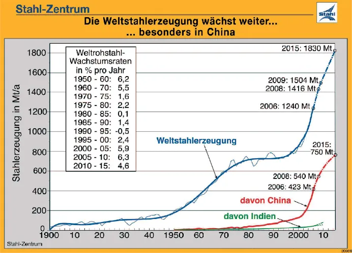 Die Abb. 1.1 zeigt den steigenden Energiebedarf in China u. a. durch einen starken Anstieg der Stahlerzeugung seit den 1990er‐Jahren. Im Jahr 2014 produzierte China ca. 50 % der Welt‐Rohstahlerzeugung (ca. 834 Mio. Tonnen Rohstahl) (Quelle: World Steel Association).