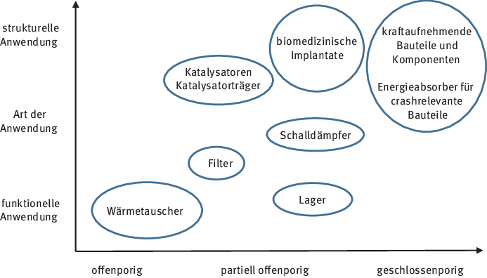 Abb. 1.2 Mögliche Anwendungen metallischer Schäume als Funktion der Porosität. Quelle: [39]