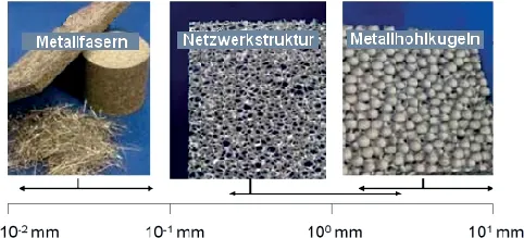 Abb. 1.3 Strukturtypen und Porengrößen unterschiedlicher poröser Metalle (Metallfaser, offenporiger Metallschaum, Hohlkugelstruktur. Quelle: [165]