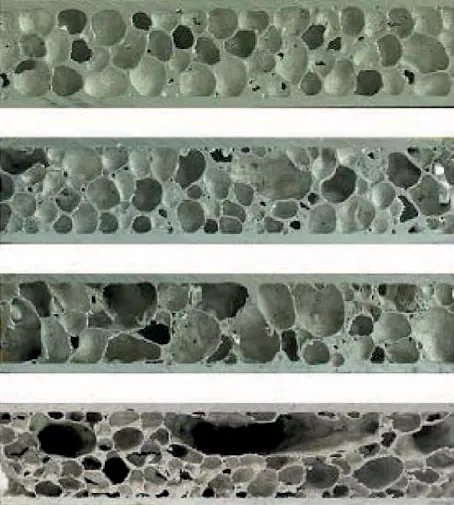 Ein entscheidender Grund für die immer noch prototypenhafte Anwendung oder Kleinserienfertigung von porösen Metallen bzw. geschlossenporigen Aluminiumschäumen ist die ungleichmäßige Verteilung der Poren in Größe und Geometrie. Auch dadurch weisen die Metallschäume im Vergleich zu den entsprechenden Monomaterialien immer noch zu geringe mechanische Eigenschaften auf, was ihren Einsatz stark hemmt. Der Sandwichverbund mit einem Aluminiumschaumkern ist heute noch die bekannteste und am häufigsten eingesetzte Anwendung von Aluminiumschäumen. Die Abb. 1.4 zeigt für verschiedene Aluminiumschäume (hier als Kernschicht in einer Sandwichstruktur) die Schwankungen der Porengröße und -verteilung.