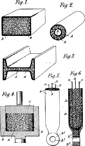 Die Entwicklung der Metallschäume begann 1925 in Frankreich mit einem Patent von De Meller über die Herstellung erster metallisch aufgeschäumter Materialien. Das Patent wurde 1926 offengelegt [15]. Die Abb. 2.1 zeigt einige auf- und ausgeschäumte Bauteile (Fig. 1 bis 6) aus den Originalskizzen des Patents.