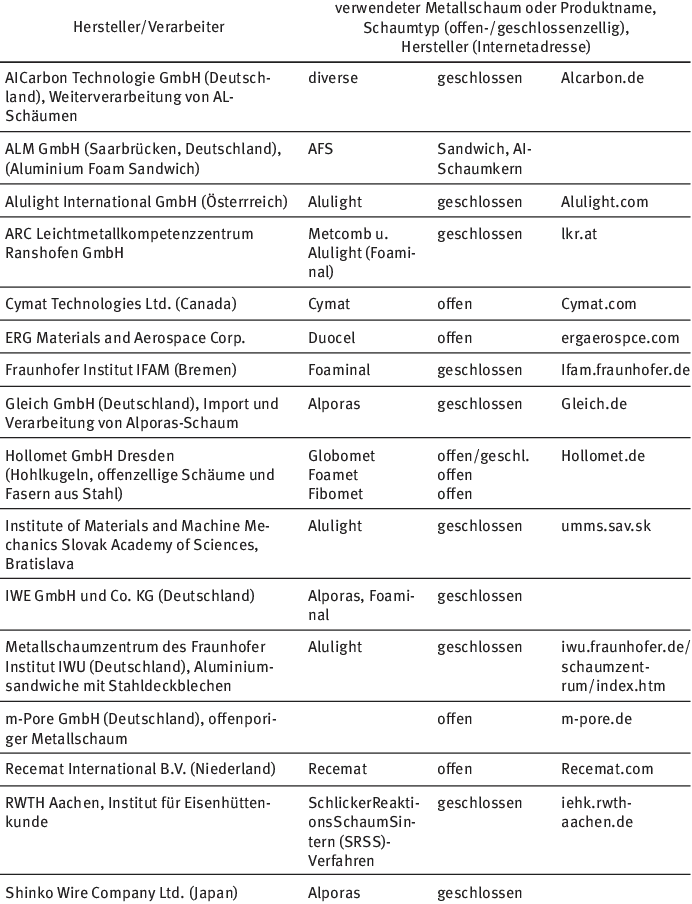 Tab. 1.1Hersteller von Aluminiumschäumen.
