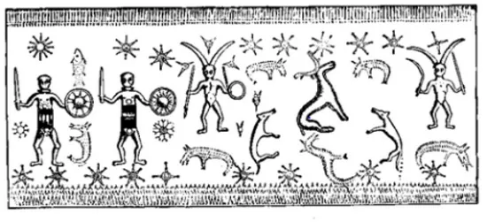 Auf den beiden rituellen Trinkhörner von Gallehus, die um 400 n.Chr. hergestellt worden sind, ist u.a. eine Gestalt im Jenseits abgebildet, die einen Speer, einen Stab und einen Ring trägt (Mitte links). Diese Gestalt ist als „Mann im Jenseits“ erkennbar, da sie nackt ist und Hörner an ihrem Kopf trägt – zudem ist sie von Wasserwellen (Wasserunterwelt) und Sternen (Seelen) umgeben.