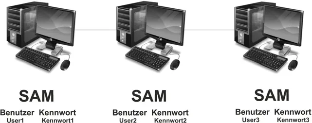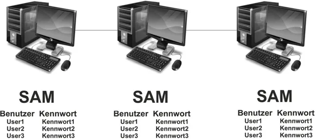 In einer Arbeitsgruppe ist diese Datenbank lokal auf jedem Computer gespeichert. Sie heißt Security Account Manager (SAM).