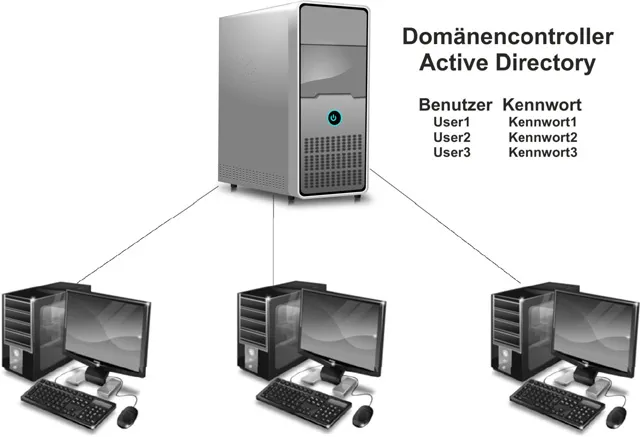 In einer Domäne ist mindestens ein ausgewählter Computer dafür da, dass er eine Datenbank speichert, auf der alle Anmeldeinformationen aller Benutzer zentral gespeichert sind.