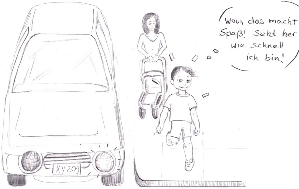 Das Kind im ersten Beispiel, Joshua, fand es vielleicht ganz toll, schnell einen Hügel hinunter zu rennen und sich mal von der Mutter zu entfernen. Die Gefahr der Straße, die die Mutter versucht hat ihm durch ihr Schreien mitzuteilen, bemerkte er wahrscheinlich gar nicht. Dieser Egozentrismus endet bzw. das Gespür dafür, sich in die Lage eines anderen Menschen hineinzuversetzen beginnt im Allgemeinen ab ca. sechs Jahren, also zum Eintritt in die Grundschule. Bei manchen Menschen geschieht dies früher, bei anderen kann es bis ins Jugendalter – oder noch länger – andauern.