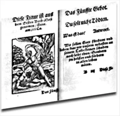 Luther fährt in seinem Lehrbuch mit Fragen und Antworten fort: über die 10 Gebote, den Glauben, das Vaterunser, die Taufe, die Beichte und das Abendmahl.