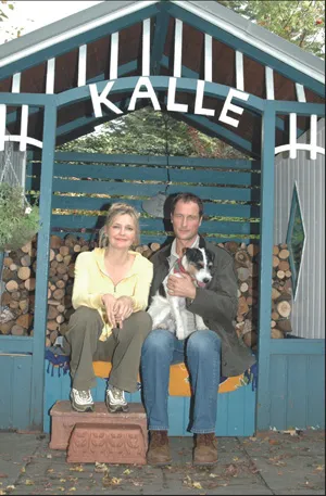 Das Zuhause von Familie Andresen aus der Serie „Da kommt Kalle“. Rechts: die Hauptdarsteller Kaharina Schubert und Markus Knüfken mit dem Polizeihund „Kalle“ auf dem Schoß.