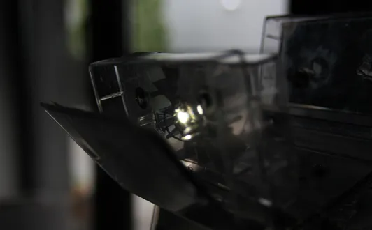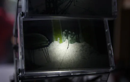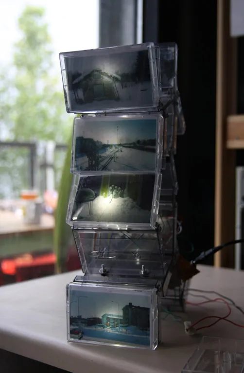 A ultrasonic sensor tracks the distance of the viewer to the sculpture and brings up LEDs behind the MC cases while the viewer comes closer to the sculpture. Once the viewer is very close all LEDs are up and the viewer can see all 4 images.