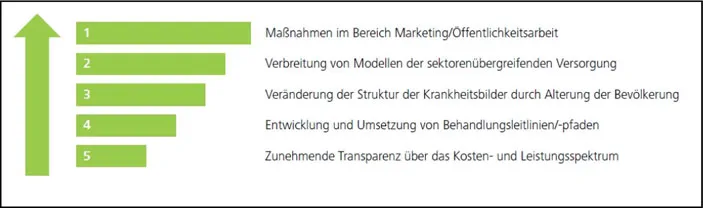Wie bereits weiter oben festgehalten, kommt auch die Deloitte-Studie zu dem Ergebnis, dass der Kostendruck weiter anhalten wird. Am Zweitwahrscheinlichsten wird der Fortgang des demographischen Wandels gesehen. An dritter Position folgt die Einschätzung, dass kommunale Kliniken in Zukunft ein verstärktes Augenmerk auf das Marketing legen müssen. Dies liegt größtenteils darin begründet, dass Krankenhäuser heutzutage geradezu um ihre Patienten kämpfen müssen, weil ein anhaltender Druck zur Fallzahlsteigerung besteht (siehe Nr. 9 der TOP10).6 Weiterhin wurde untersucht, welche Entwicklungen die Fachleute als Chance (TOP5) für kommunale Krankenhäuser betrachten (siehe Abbildung 2):