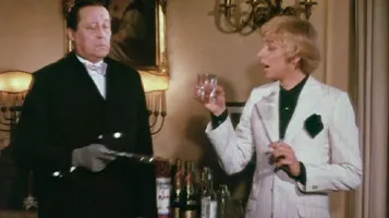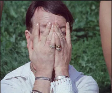 Zu den vielen klischeehaft tuntigen Gestiken gehören ausladende und theatralisch wirkende Handbewegungen wie das Abspreizen des kleinen Fingers. Bei der sogenannten Knickhand, auch als gebrochenes Handgelenk bezeichnet,156 wird die Hand in Höhe des Brustkorbs gehalten und die Hand schlaff am Handgelenk heruntergehängt, wie beim klischeehaft schwulen Steward in Gebissen wird nur nachts (1971). Eine weitere Gestik ist der sogenannte Colliergriff, der u.a. in Alpenglühn im Dirndlrock (1974) zu beobachten ist. Dieser Handgriff trägt diesen Namen, weil er so wirkt, als wolle man den Sitz eines Colliers überprüfen, und besteht darin, sich mit der Handinnenfläche bei abgespreizten Fingern an das Brustbein beim Halsansatz zu fassen, was sich insbesondere zur Unterstreichung von Emotionen anbietet.