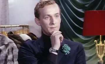 Die Inszenierung des schwulen Modedesigners Emilio Gavin in Lange Beine – lange Finger (1966, s. Bild) wirkt selbstbewusster als andere, denn schließlich wird er nicht nur in pink, sondern u.a. mit dem schwulen Identifikationssymbol einer grünen Nelke gezeigt.164 Zwischen dieser selbstbewussten Geste in Form einer insiderhaftigen Anspielung und der Homosexualität des Regisseurs Alfred Vohrer kann ein Zusammenhang gesehen werden.