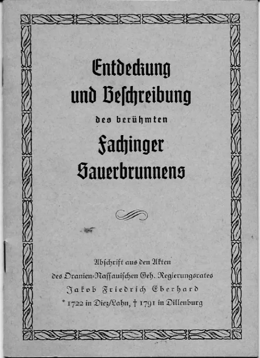Der Ursprung der Dinge ist und bleibt mehrentheils verborgen. Sie sind Anfangs klein, und entziehen sich der Aufmerksamkeit. Endlich entdecket sie ein Zufall, und man erkennet bereits ihren Nutzen, ohne zu wissen, wie die Entdeckung geschehen, und wer sie gethan. Eben die Bewandnis hat es mit unserem Gesundbrunnen. Niemand achtet auf diese vortreffliche Quell. Hier und da zeigten sich ähnliche, die entstunden und wieder vergingen. Ja sogar zu Dietz an der Ahr [Aar, linker Nebenfluss der Lahn, entspringt in Taunusstein] hatte man eine solche mineralische Quelle eingefaßt, die, wie die Fachinger, einen eisenhaltigen Ocker anlegte, und ein angenehmes Sauerwasser war, das Kranken und Gesunden wohl bekam, aber nicht beständig, und stark genug floß. Dermalen ist nichts mehr davon zu sehen. Die Quelle zu Fachingen hielt an, und verlor sich zu keiner Zeit. Den ältesten Leuten war sie als ein vortreffliches Sauerwasser bekannt. Die Eigenthümer der Wiesen, und die vorbeifahrenden Schiffer labten sich oft an derselben. Nur war sie zu einer Zeit reiner und stärker, als zur andern, nachdem das Berg- und Lahnwasser sich mehr oder weniger mit ihr vermischte, und ihr den freyen Ausbruch lies. Endlich kam ein Schiffmann aus Cöln, der eine lange und beschwerliche Verstopfung des Leibes hatte, und trank in seinen Durst reichlich von diesem Wasser. Es schaffte ihm Oeffnung, und er pries es über alle Arzneien. Mehrere Kranke bedienten sich seiner und wurden gesund. - Der Gerichtsschöpfe und Chirurgus Bender zu Dietz trug nicht wenig zum Gebrauche und zur Aufraumung des Brunnens bey. Es entdeckten sich mehrere, und starke Quellen, die gut befunden wurden. Nun kam das „Fachinger Wasser“ in den Ruf. Es war leichter, und in Menge zu haben. Aber nun wollte es auch ein jeder trinken, und es ward von allen umliegenden Orten so stark geholet, daß der Brunnen vom Morgen bis in die Nacht nicht mehr leer war, und die Leute sich fast wie beym Teiche Bethesda zudrangen. Diese Beschaffenheit mit demselben hatte es in den Jahren 1745 und 46 Ausweis der erstatteten pflichtmäßigen Berichte. Das ist der Anfang, da dieser Gesundbrunnen, wo nicht entdecket, doch zuerst recht bekannt, und als ein Heilwasser gebraucht wurde. Besonders zeigte es seine Kraft in Brust- und Nierenbeschwehrungen, und vornähmlich in hartnäckigen Verstopfungen des Unterleibes. Eine Frau, die mit letzterem behaftet war, sagte zu seinem Ruhm: Das Fachinger Wasser verschaffte ihr eine solche Oeffnung, daß, wenn sie auf dem Guckenberge [die Anhöhe vor der Stadt, wenn man von Fachingen kommt], stünde, sie Bomben in Dietz werfen könnte. – Noch war das Wasser nicht ganz rein, und zeigte sich gleichwohl so wirksam. Man hatte Erde und Steine, welche den Brunnen verstopften, nur etwas weggeräumt; da brachen verschiedene Quellen hervor, die stark, aber doch immer mit wildem Wasser vermischt waren. Die Landesregierung verfügte nun die Probierung und Fassung des Brunnens. Dem Dr. Forell, einem erfahrenen Arzte, der verschiedene gute Einrichtungen zu Embs mit dem Bad- und Trinkwasser gemacht hatte, geschah der Auftrag; und er probierte den Fachinger Brunnen, wie er damals war. Aus 3 Schoppen brachte er auf dem Feuer 42 Gramm [oder Gran?] ächtes alcalisches Salz heraus, und eine weisgrauliche Erde 6 bis 7 Gramm schwehr, worin er damals kein Eisen- und Stahlteilchen entdecken konnte. Nach der Wasserwage war es überaus leicht, und sehr geistreich. Er fand etwas Weniges von Schwefel und mehr von einem heilsam, ätherisch flüchtigen Vitriol darin. Er schloß aus diesen Bestandtheilen auf seinen reitzenden angenehmen säuerlichen Geschmack, und seine vortreffliche eröffnende Kraft und hielt es für eines der besten Heilwasser in Deutschland.