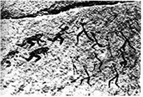 Abb. 1: Felsmalerei der Buschleute. Sie zeigt einander bekämpfende bewaffnete Gruppen verschiedenen Typs. Drakensberge, Republik Südafrika (Foto: I. Eibl-Eibesfeldt).