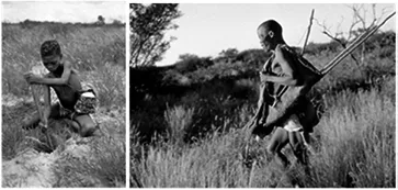 Abb. 3: a) Buschmann-Mädchen beim Ausgraben einer Wurzel; b) Buschmann (San) bei der Jagd (Fotos: I. Eibl-Eibesfeldt).