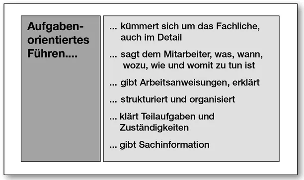 Aufgabenorientierte Führung bedeutet, durch detaillierte Einflussnahme auf der Sachebene die Aufgabenerledigung der Mitarbeiter zu steuern.