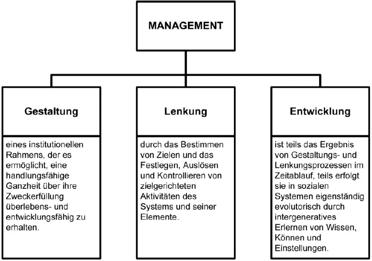 Bleicher beschreibt die Aufgaben des Managements anhand der drei Funktionen Gestaltung, Lenkung und Entwicklung die in Abbildung 1 dargestellt sind. Die Funktionen der Gestaltung und der Entwicklung spielen hierbei für ihn eine wesentliche Rolle.2