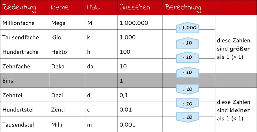 Für diese Untereinheiten hat man bestimmte Vorsätze gewählt, die vor dem eigentlichen Namen der Grundeinheit gesetzt werden. Nachfolgend habe ich dir die gängigen Vorsätze der Einheiten als Tabelle zusammengefasst: