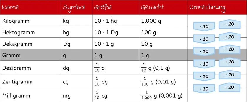 Wenn du diese Vorsätze vor die Grundeinheit Gramm setzt, erhältst du die nachfolgenden Untereinheiten: