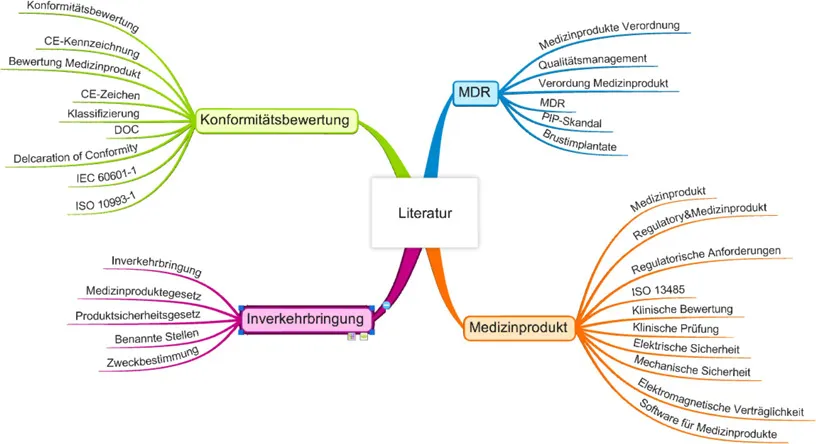 Die Arbeit besteht aus zwei Teilen: Der erste umfasst die Kapitel 2 und 3. In Kapitel 2 werden die rechtlichen Rahmenbedingungen der Inverkehrbringung von Medizinprodukten beschrieben. In Kapitel 3 werden die Entwicklung, das Qualitätsmanagement und das KBV von Medizinprodukten erläutert. Dieser Teil der Arbeit basiert auf einer Literaturrecherche, die mit Hilfe von Suchbegriffen (Keywords) durchgeführt wurde, von denen der Autor der vorliegenden Arbeit aufgrund seines bis dahin bestehenden Vorwissens vermutete, dass sie dabei helfen würden, eine strukturierte Analyse der thematisch relevanten, vorliegenden Literatur vorzunehmen. Diese Suchbegriffe sind in der folgenden Mindmap dargestellt:
