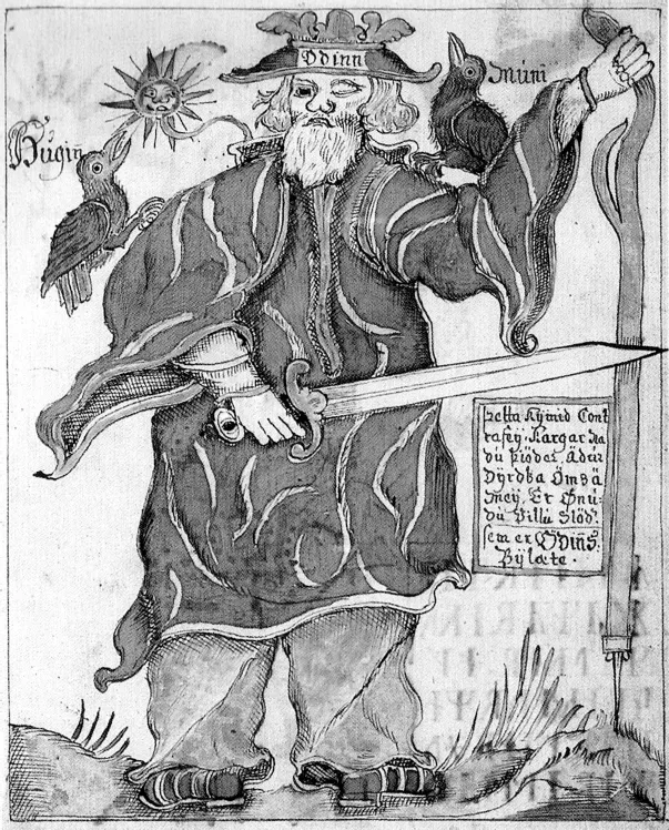 Abb. 1: Darstellung des Gottes Ódinn (Wodan) mit seinen beiden Raben und Sonnensymbol. Aus einer Handschrift der Jüngeren Edda von 1760, die auf eine verlorene Vorlage von 1665 zurückgeht, die selbst wiederum eine Abschrift der Originalhandschrift (13. Jh.) war.