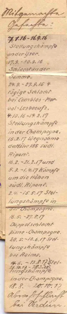Vom 17. bis zum 30. September wurde er in südlicher Richtung in die Nähe des Ortes Morval verlegt, wo seit Anfang Juli die „Schlacht an der Somme“ tobte, eine der größten Schlachten an der Westfront. Sie war durch eine britisch-französische Großoffensive gegen die deutschen Stellungen eröffnet worden und wurde am 18. November abgebrochen, weil es zu keiner militärischen Entscheidung gekommen war. Mit einer Million getöteter und vermisster Soldaten wurde sie zur verlustreichsten Schlacht des Ersten Weltkrieges. Bei der Schlacht bei Combles-Morval, an der mein Großvater ausweislich seines Militärpasses im September teilnahm, war auf Befehl der Obersten Heeresleitung das deutsche Reserve – Korps unter General Otto von Hügel von Flandern nach Combles verlegt worden zur Unterstützung der dort kämpfenden Armeen. An dieser Aktion war mein Großvater offenbar beteiligt.