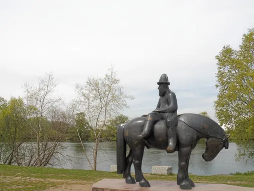Bei kühlem aber sonnigem Wetter starte ich meine Reise in Gelnhausen. Ich folge der Kinzig bis Hanau, dort geht es weiter am Main entlang in Richtung Frankfurt bis nach Mainz-Kastel. Bei Rüsselsheim fällt mir das lebensgroße Bronzestandbild des Leinreiters auf. Eine Tafel informiert: „Vor dem Einsatz der Dampfmaschine in der Schifffahrt wurden die Schiffe stromaufwärts von Pferden an der Leine gezogen.“ Wege rechts und links des Mains sind davon noch übrig geblieben, jetzt als Fahrradwege ausgebaut mit glattem Asphalt. Der Leinreiter, wie das Kunstwerk ihn darstellt, sitzt bequem auf seinem großen und kräftigen, muskelbepacktem Pferd, das weiß seinen Weg selbst, der Weg liegt ja klar vor ihm; es muss nur geradeaus laufen und darf weder nach links noch nach rechts sehen. Der Reiter schaut nach hinten und prüft, ob die Leinen richtig gespannt sind, das Schiff gut vorankommt, und nicht gegen ein Hindernis am Ufer stößt. Dabei muss er auch mit dem Steuermann auf dem Schiff gut kommunizieren; beide sind darauf angewiesen, zusammenzuarbeiten, um das Schiff in der Spur zu halten. Das Pferd trottet brav vor sich hin, mit all seinen Kräften sich gegen den Zug der Leinen stemmend, um die schwere Last gegen die Strömung voranzubringen, die Augen nach unten auf den Weg, unmittelbar vor die Füße gerichtet. Es muss nur auf die Zeichen für „Halt!“ und „Weiter!“ reagieren.