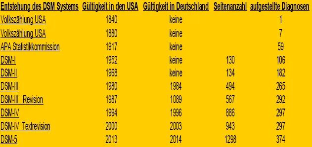 | Entstehung des DSM Systems | Gültigkeit in den USA | Gültigkeit in Deutschland | Seitenanzahl | aufgestellte Diagnosen |