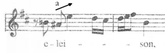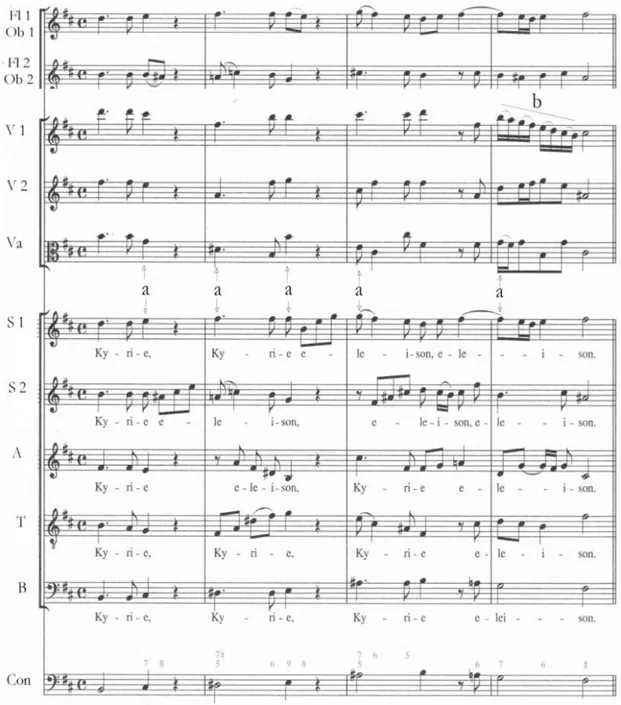 Die Spitzennoten (a) des Themas durchschreiten mit ihrer Chromatik der „eleison“-Töne eine Quart aufwärts, (nur das „c“ fehlt) und deuten damit eine musikalische Figur an, die im weiteren Verlauf der Messe, wie auch im gesamten Werk Bachs, eine große Rolle spielt und von Zeitgenossen als „passus duriusculus“ (ein etwas harter Gang) beschrieben wird. Ich komme darauf zurück4, wenn sie uns zum ersten Mal vollständig, wenn auch immer noch verborgen entgegentritt.