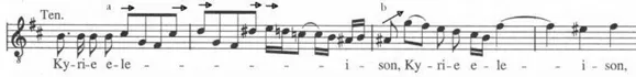 Die ersten vier Takte wirken wie ein qualvoller, markerschütternder Urschrei1, wie das Artikulieren eines heftigen, bedrängenden Urschmerzes. In dissonanten Akkordballungen (a) wird mit dem fünfstimmigen2 Chor wiederholt das Wort Kyrie (Herr) ausgestoßen. Wie ein Ertrinkender verzweifelt seine Arme hochwirft, so recken sich auf das eleison (erbarme Dich) Dreiklänge nach oben. Im letzten Takt durchschreiten die 1.Violinen unter Seufzern eine ganze Oktave (b) – eine bei Bach häufig verwandte Formel fallender Sekunden, immer mit „Tränen und Weinen“ assoziiert3. Chor und Orchester landen auf der Spannung der Dominante.