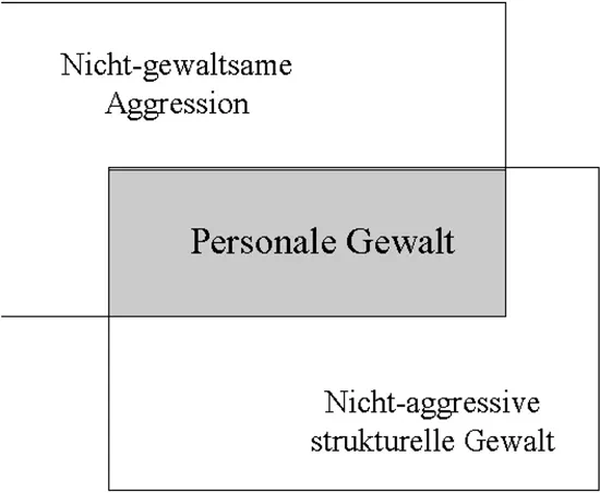 Nach Nolting (1997) muss man die Gewalt von der Aggression unterscheiden. In der folgenden Abbildung wird deutlich, dass die in diesem Artikel angesprochene personale Gewalt eine Schnittmenge ist zwischen gewaltsamer Aggression und nicht aggressiver struktureller Gewalt. Nicht gewaltsame Aggression ist zum Beispiel in der Tierwelt zu beobachten: ein Fuchs reißt ein Huhn. Hier haben wir es zwar mit Aggression zu tun, allerdings würde man diese alleine nicht als gewalttätig bezeichnen. Man kann also unterscheiden in: