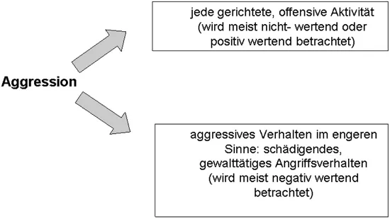 In der Literatur wird oft auch der Aggressionsbegriff noch einmal unterteilt in eine gerichtete, offensive Aktivität (wie z. B. es in zahlreichen menschlichen Handlungssituationen zu beobachten ist). Davon wird das aggressive Verhalten im engeren Sinne unterschieden, unter den das schädigende, gewalttätige Angriffsverhalten zählt. Wichtig ist, dass die erste Form durchaus positiv bewertet wird, die zweite hingegen negativ.