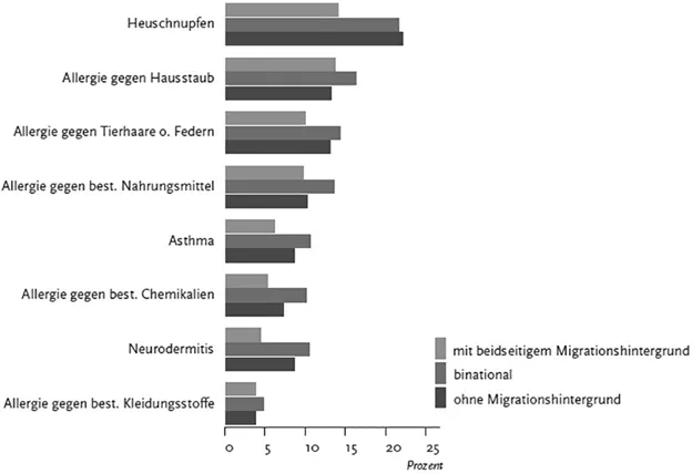 Kinder mit Migrationshintergrund weisen bei somatischen Erkrankungen wie z. B. Bronchitis, Asthma und Allergien einen besseren Gesundheitszustand auf, aber einen schlechteren bei Anämien, Tuberkulose und Übergewicht.