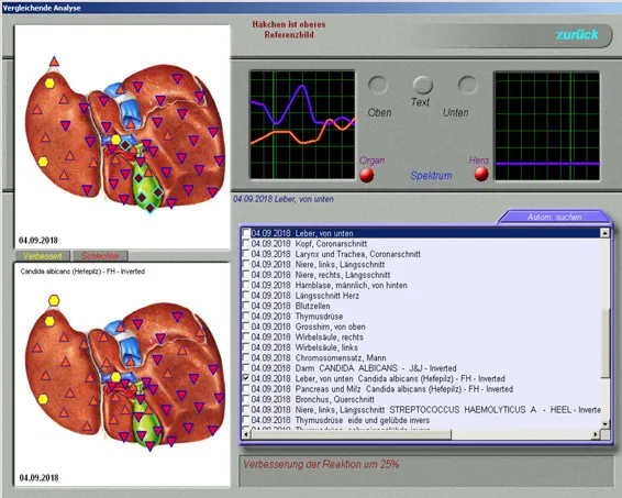Abb. 2: Leber von unten: Energetische Störung, bei Invertierung von Candida albicans Verbesserung der energetischen Reaktion um 25%.