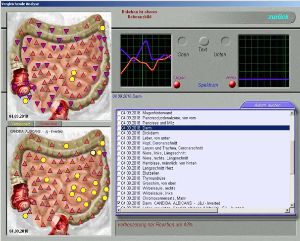 Abb. 1: Darm: Energetische Störung, bei Invertierung von Candida albicans Verbesserung der energetischen Reaktion um 42%.