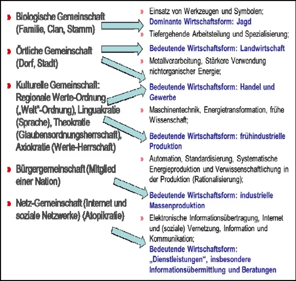 Das „System“, verstanden als evolutionäre und sozialstrukturelle Emergenz von Handlungsformen sozialer Akteure15, manifestiert sich kulturanthropologisch in politischen und ökonomischen constraints, d.h. technik-unterstützten Lebensräumen.16 Die kulturanthropologische Systememergenz zeigt sich in der folgenden Darstellung historischer Abfolgen technik-unterstützter Lebensräume (die historischen Zuordnungen finden sich in Abb. 1 und →)17: